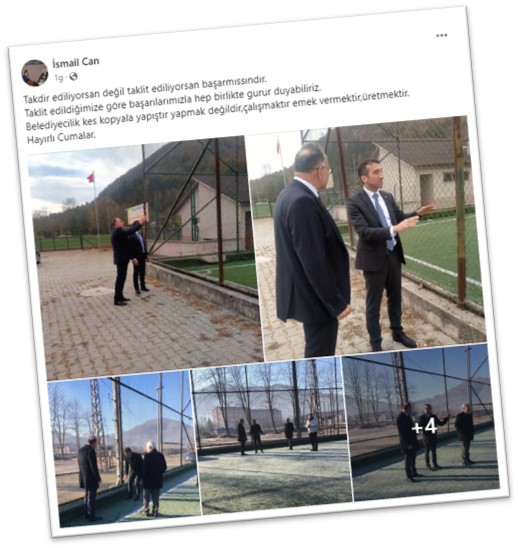 İsmail Can, Bozkurt’un paylaşımına cevap vererek, Kumluca’daki halı sahanın fotoğrafını paylaştı ve “Takdir ediliyorsan değil, taklit ediliyorsan başarmışsındır. Taklit edildiğimize göre başarılarımızla hep birlikte gurur duyabiliriz. Belediyecilik kes kopyala yapıştır yapmak değildir, çalışmaktır, emek vermektir, üretmektir” şeklinde mesaj verdi.