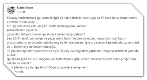 Keser, yaptığı açıklamada, “Biz işçi alımlarına karşı değiliz, hatta destekliyoruz. Ancak adaletli bir şekilde yapılmalıdır. Gerçekten ihtiyacı olanların işe alınması gerekmektedir. Ancak, 30-31 Aralık gibi halkın haberi olmadan ve önceden belirlenmiş kişilere iş verilmesi kabul edilemez. Bu tür uygulamaları yangından mal kaçırır gibi görmekteyiz ve bunun karşısında olmaya devam edeceğiz” ifadelerini kullandı.